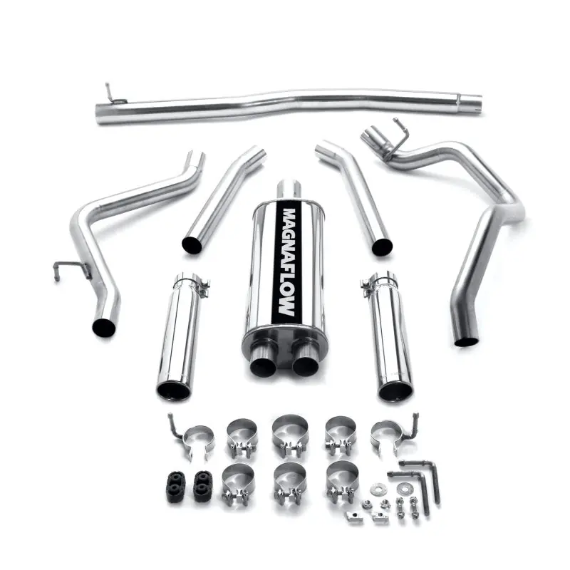 The MagnaFlow Street Series Cat-Back Performance Exhaust System 16622 brings out the personality of your Truck with our signature resonant, powerful engine tone and dyno-proven performance. Thanks to its fast-flowing, mandrel bent 3in. main piping and 1 Straight-Through mufflers ending in a Dual Split Rear exit with 3.5in. Polished Clamp-On Single Wall Angle Cut Rolled Edge tips, this Truck exhaust kit has the performance chops to match its sporty sound and appearance. Upgrade your ride to the next level with an exhaust that has the pipes to put other Truck’s to shame. With this system your vehicle will be producing Aggressive exterior and Moderate interior sound levels while leaving other cars and trucks feeling envious at every stoplight. Exhaust kit 16622 features a cat-back layout that replaces your ride’s stock exhaust components from near the catalytic converter on back. Extensive 3D scanning during development has resulted in a direct-fit design that you can easily install yourself. 16622 is produced using CNC precision robotic manufacturing techniques and is backed by MagnaFlow’s 1-year limited finish warranty and limited lifetime construction warranty.
