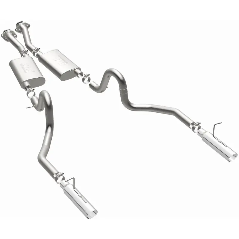 - The MagnaFlow 1994-1998 Ford Mustang Street Series Cat-Back Performance Exhaust System brings out the personality of your 4.6L, 5.0L 1994-1998 Ford Mustang with our signature resonant, powerful engine tone and dyno-proven performance. Thanks to its fast-flowing, mandrel bent 2.5in. main piping and 2 Straight-Through mufflers ending in a Dual Split Rear exit with 3.5in. Polished Clamp-On Single Wall Angle Cut Edge tips, this Ford Mustang exhaust kit has the performance chops to match its sporty sound and appearance. Upgrade your ride to the next level with an exhaust that has the pipes to put other Ford Mustang’s to shame. With this system your vehicle will be producing Moderate exterior and Mild interior sound levels while leaving other cars and trucks feeling envious at every stoplight. Exhaust kit 15638 features a cat-back layout that replaces your ride’s stock exhaust components from near the catalytic converter on back. Extensive 3D scanning during development has resulted in a direct-fit design that you can easily install yourself. 15638 is produced using CNC precision robotic manufacturing techniques and is backed by MagnaFlow’s 1-year limited finish warranty and limited lifetime construction warranty.