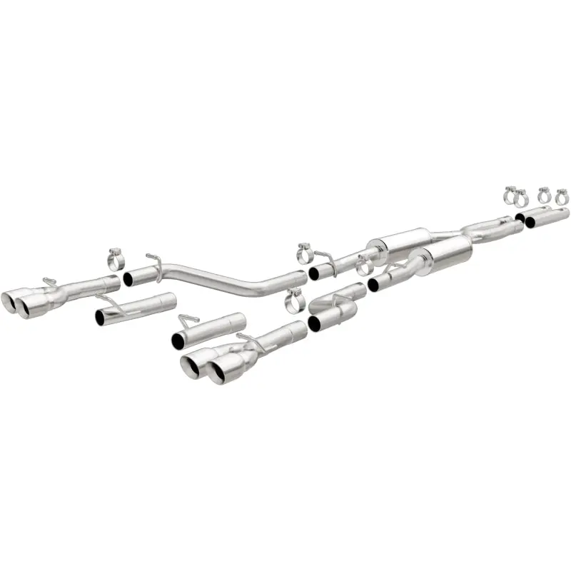 - The MagnaFlow 2015-2023 Dodge Challenger Competition Series Cat-Back Performance Exhaust System 19217 brings an aggressive, attention-grabbing edge to the deep resonant exhaust note we’re so well known for. This exhaust kit is designed to enhance your 3.6L 2015-2023 Dodge Challenger with dyno-proven performance made possible thanks to fast-flowing mandrel bent 2.5in. main piping and 2 Straight-Through mufflers ending in a Quad Split Rear exit with 3.5in. Polished Welded-On Double Wall Angle Cut Folded Edge tips featuring a sporty finish. The exhaust system’s cat-back layout replaces your ride’s exhaust system from near the catalytic converter on back. Exhaust system 19217 is engineered to make your vehicle’s engine produce Aggressive exterior and Moderate interior sound levels, befitting its competition-oriented design. 19217’s direct-fit design makes installation a breeze thanks to the use of advanced 3D scanning techniques. This performance exhaust system is made of 100% durable and corrosion-resistant stainless steel and produced using CNC precision robotic manufacturing, all backed by MagnaFlow’s limited lifetime warranty. Please check to ensure compliance with local noise regulations.