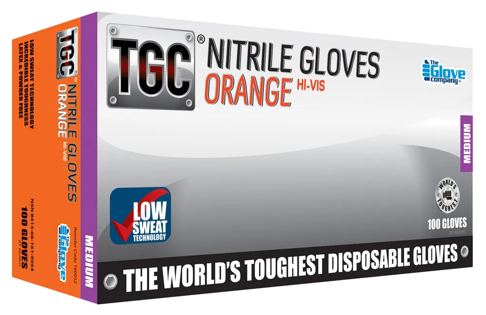 The Glove Company (TGC) Orange Nitrile disposable gloves are the most advanced protective disposable gloves. The only hi-vis orange disposable glove certified for NATO use by the defence forces and the aviation industry. The gloves feature a high-impact orange visual contrast surface, making it is easy to detect hazardous contaminants and prevent cross-contamination. Latex, Vinyl and MBT free.