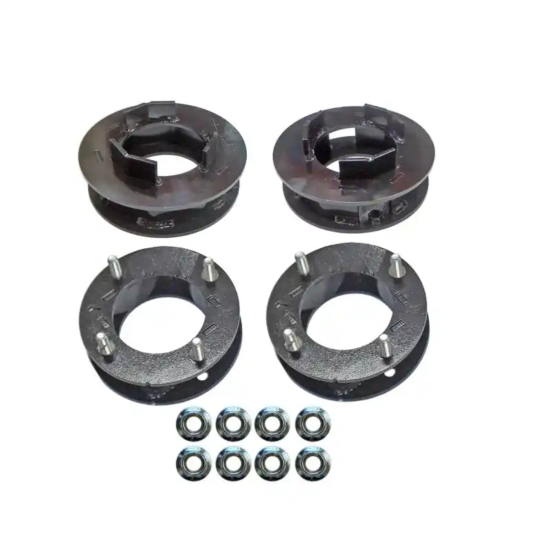 One-piece upper mount front strut spacers and rear coil spring spacers integrate smoothly with the factory suspension geometry. The strong tab-and-slot interlocked design of the 1-piece upper mount spacers delivers a strong, long lasting product. Precise CNC laser cut and precision formed in CNC press break, there is expert workmanship in every component. These are powder coated to provide an extremely durable protective barrier to prevent corrosion. Complete with high-quality grade mounting hardware. Aligns to OEM factory specifications.