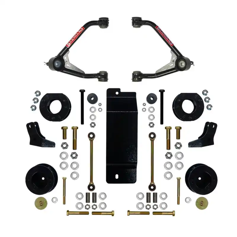 Skyjacker 3.5-4in. A-Arm kit includes everything required for a 100% bolt on installation & includes value added extras! Skyjacker A-Arms are made of high strength DOM (Drawn Over Mandrel) tubing to withstand extreme stresses & loads with an additional 1/4in. gusset plate stiffener welded in between the A-Arms for added rigidity & strength. The A-Arms are designed to incorporate optimum pivot ball joints to allow for faster & easier alignment and greaseable to increase life & flexibility. Kit features front strut spacers, front differential skid plate, front differential spacer kit. Includes rear blocks & 2 rear Skyjacker shocks.