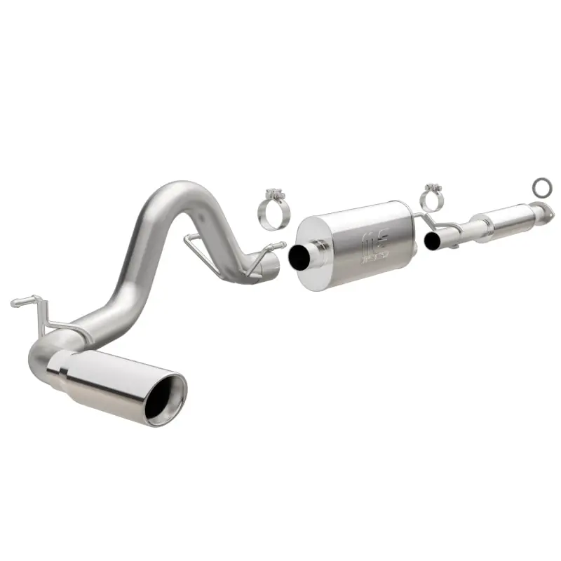 The MagnaFlow 2016-2023 Toyota Tacoma Street Series Cat-Back Performance Exhaust System brings out the personality of your 3.5L 2016-2023 Toyota Tacoma with our signature resonant, powerful engine tone and dyno-proven performance. Thanks to its fast-flowing, mandrel bent 3in. main piping and 2 Straight-Through mufflers ending in a Single Passenger Side Rear exit with 4in. Polished Welded-On Double Wall Angle Cut Rolled Edge tips, this Toyota Tacoma exhaust kit has the performance chops to match its sporty sound and appearance. Upgrade your ride to the next level with an exhaust that has the pipes to put other Toyota Tacoma’s to shame. With this system your vehicle will be producing Moderate exterior and Mild interior sound levels while leaving other cars and trucks feeling envious at every stoplight. Exhaust kit 19293 features a cat-back layout that replaces your ride’s stock exhaust components from near the catalytic converter on back. Extensive 3D scanning during development has resulted in a direct-fit design that you can easily install yourself. 19293 is produced using CNC precision robotic manufacturing techniques and is backed by MagnaFlow’s 1-year limited finish warranty and limited lifetime construction warranty.