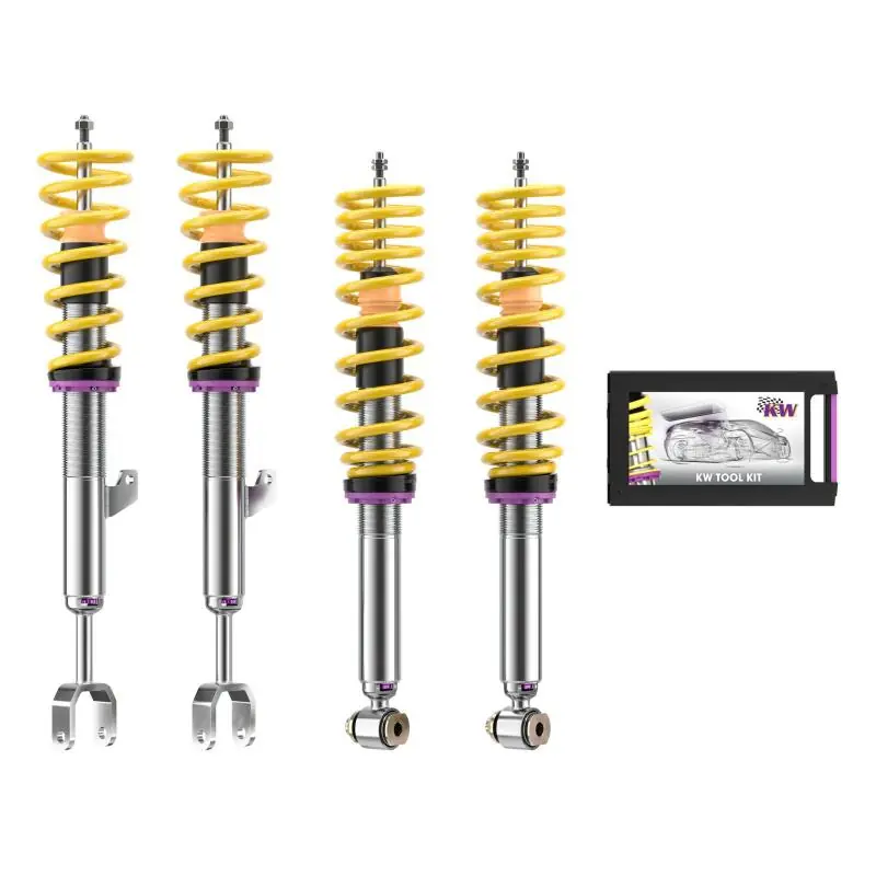 - The KW V3 Leveling coilovers are ideal for drivers who are looking for the improved driving dynamics of a KW V3 coilover suspension with the ground clearance near that of a stock vehicle. The KW V3 Leveling coilovers are for drivers who frequent poorly maintained roads or use their car as a daily driver in environments where maximum lowering is not advised.? The KW V3 Leveling coilovers have separate and independently adjustable low-speed rebound and low-speed compression adjustments that utilize patented TVR-A & TVC-A multi-valve technology. This allows you to further influence the preset damping characteristics to achieve the ideal ride you are looking for. If necessary, the seamlessly adjustable KW V3 Leveling coilovers allows for a subtle height adjustment to even out the car body front to rear and in some cases, you can even achieve a slight lift, providing additional ground clearance. With the KW V3 Leveling coilovers, the rolling and pitching movements of the vehicle body are reduced during compression and rebound, so you benefit from unadulterated directness and sportier handling when driving.