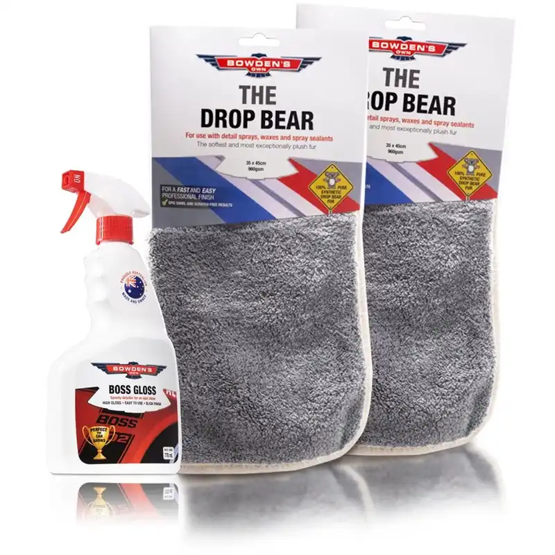 This pack combines our super glossy and easy to use Boss Gloss detailing spray and two of the super plush Drop Bear towels. It’s a combination that we use to quickly spruce our own cars up either before a tour or at a car show.