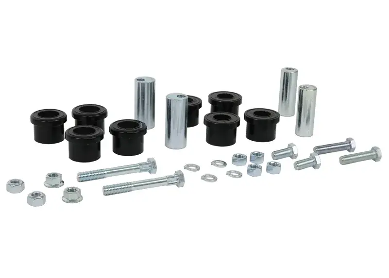 Kit Contents: 8 Bushings, 4 Tubes, 6 Bolts, 6 Washers, 4 Nuts, Install Guide, Grease