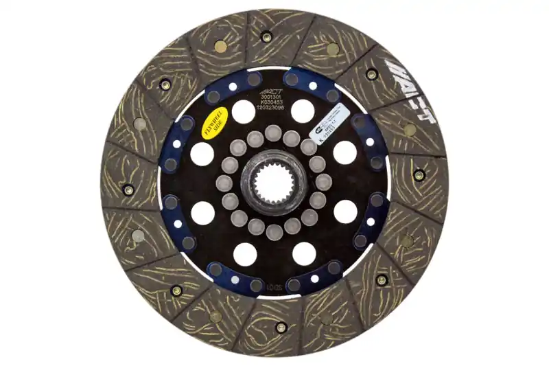 3001301 is a street rigid disc featuring premium organic materials with high copper content for better heat transfer and steel-backed lining for greater burst strength and durability. These discs are modified with reduced marcel for faster shift action to complement ACT pressure plates. The chrome-moly hub is heat-treated for strength and durability. Rivet design and materials are carefully selected for maximum strength. Lightweight, solid-hub design allows for quicker shifting and engagement. ACT’s street rigid-hub discs provide race-proven performance with street manageability.