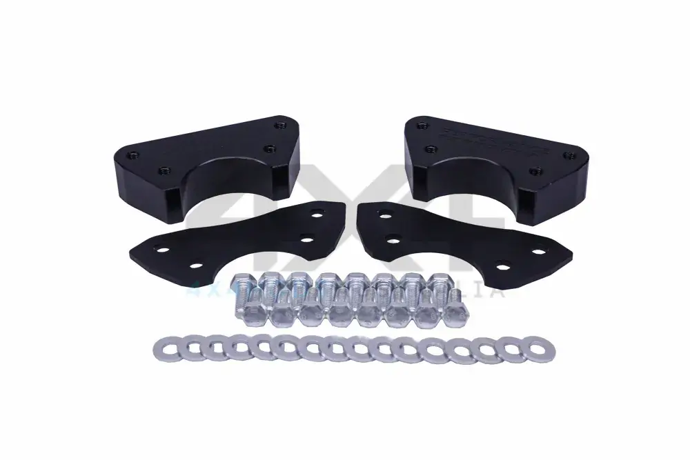 PSR’s Holden RG Colorado / 7 / DMAX / MUX ball joint spacer is designed to allow a lift above 2 inch and up to 4. When lifting this platform the upper arm will contact the droop limiter stops on the chassis making a clunk noise and limiting down travel. Our spacer not only allows more droop of the suspension for a larger lift but also rectifies 3 issues when lifting above 2″, plunge on the CV joint, negative camber once lifted and ball joints bind, the correction is done via an offset mounting position between upper and lower mounting holes and a 5 degree wedge between the two faces. Ball joint spacer is 100% bolt in with no mods to install and is machined from steel for strength. High tensile bolts are supplied with kit. A spreader plate is also supplied to disperse load on control arm. Anodized black in a long lasting finish to blend to the chassis.