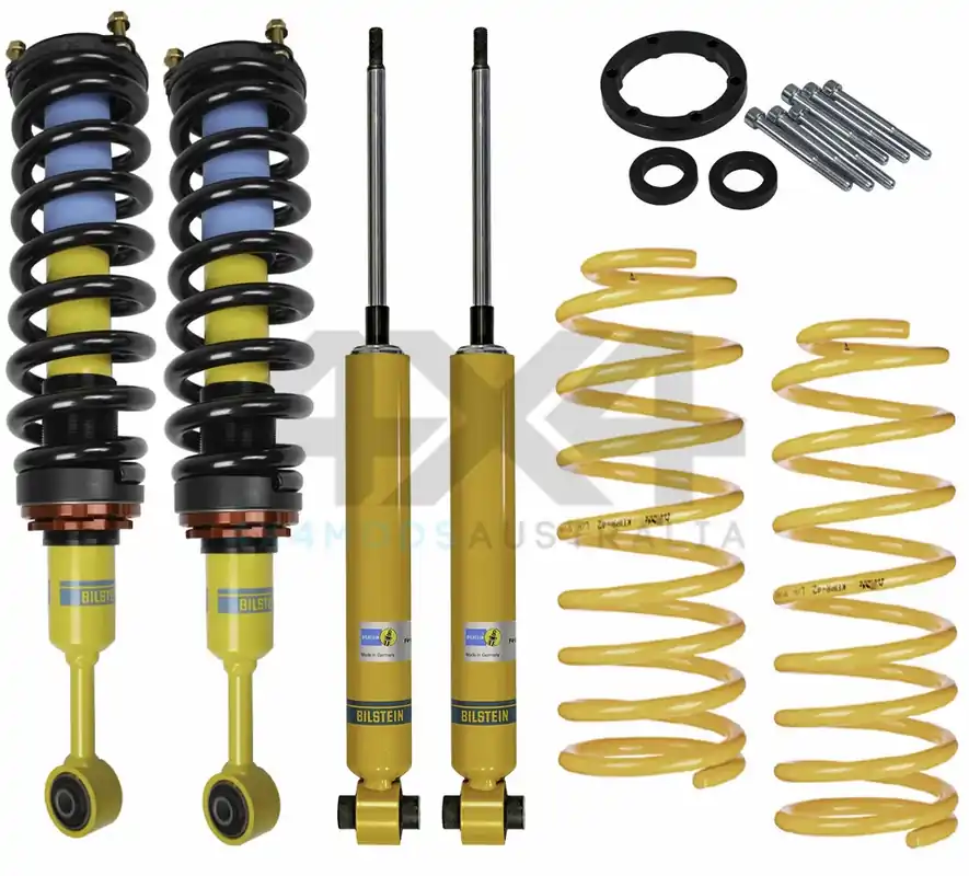 This kit contains PSR Spec Bilstein front adjustable struts all pre-assembled with Kings coil springs and HD strut tops, front tailshaft spacer & packers, Bilstein rear shocks and King Springs rear coils
