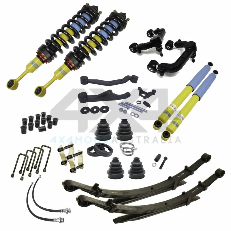 This kit utilises 3 – 4″ PSR Bilstein adjustable height front struts with Kings coil springs, PSR adjustable upper control arms, PSR arm style diff drop, PSR high clearance outer CV Boots, 2″ 300kg constant rear leaf springs, rear Bilstein shocks, bushes, U-bolts, shackles and an extension for the brake lines.