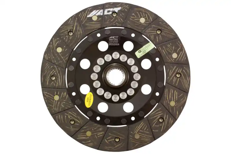 3001302 is a street rigid disc featuring premium organic materials with high copper content for better heat transfer and steel-backed lining for greater burst strength and durability. These discs are modified with reduced marcel for faster shift action to complement ACT pressure plates. The chrome-moly hub is heat-treated for strength and durability. Rivet design and materials are carefully selected for maximum strength. Lightweight, solid-hub design allows for quicker shifting and engagement. ACT’s street rigid-hub discs provide race-proven performance with street manageability.