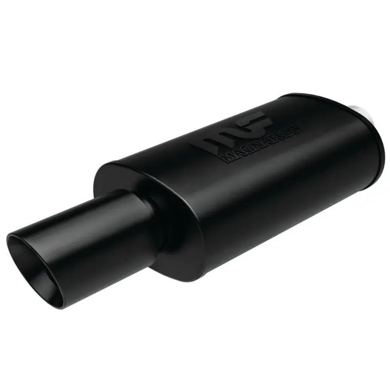 - Complete your custom exhaust with a Black coated straight-through design muffler with an integrated welded tip for a finished look and simple installation. MagnaFlow Performance Exhaust Muffler 14868 is made of durable stainless steel and built usingCNC precision robotic manufacturing techniques, all backed by MagnaFlow’s limited lifetime construction warranty and 1 year finish warranty.