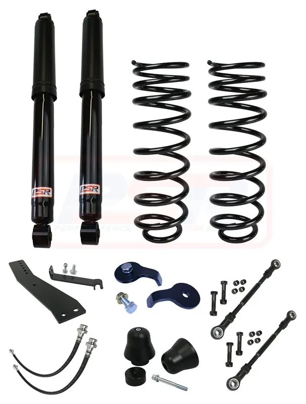 This rear only system sits at 1″ and contains PSR TTG rear shocks, flex coil, rear extended link pins, rear headlight aim extension bracket, extended brake hoses, bolt-in drop out cones and rear spring retainer.